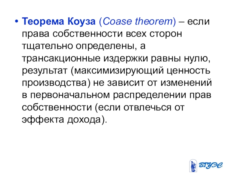 Слайд 35Теорема Коуза (Coase theorem) – если права собственности всех сторон тщательно