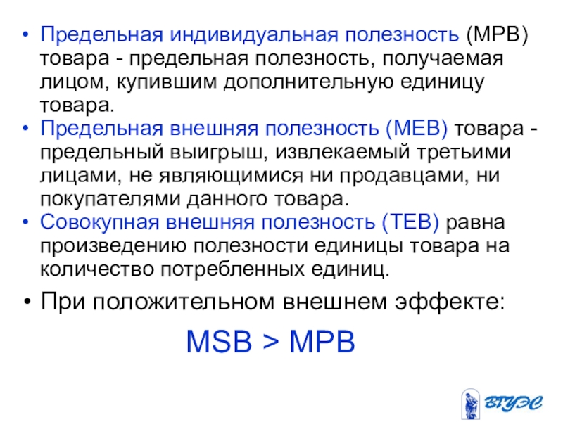 Предельная внешняя полезность (МЕВ) товара - предельный выигрыш, извлекаемый третьими лицами, не являющимися ни продавцами, ни покупателями данного товара.