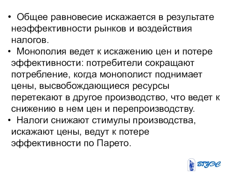 Налоги снижают стимулы производства, искажают цены, ведут к потере эффективности по Парето.