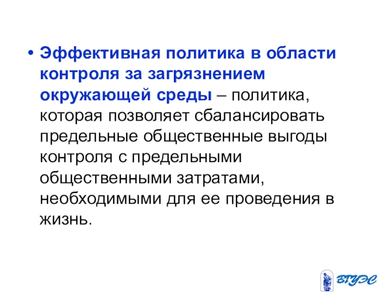 Слайд 34Эффективная политика в области контроля за загрязнением окружающей среды – политика,