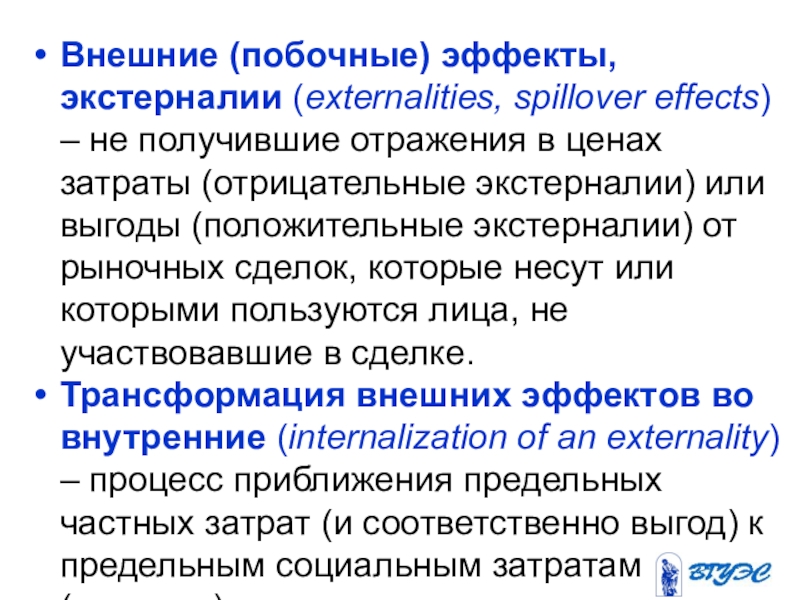 В итоге таких переговоров все не учтенные ранее в рыночных расчетах ресурсы получают денежную оценку и их собственником становится (или остается) тот экономический субъект, которому это наиболее выгодно.