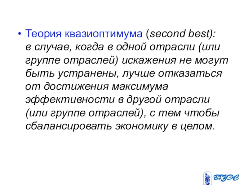 случае, когда в одной отрасли (или группе отраслей) искажения не могут быть устранены, лучше отказаться от достижения максимума эффективности в другой отрасли (или группе отраслей), с тем чтобы сбалансировать экономику в целом.