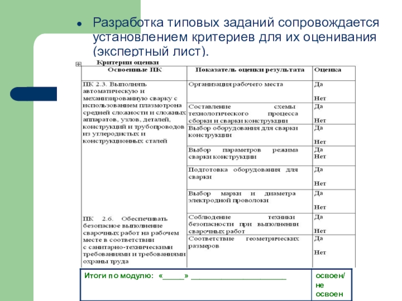 Слайд 10Разработка типовых заданий сопровождается установлением критериев для их оценивания (экспертный лист).
