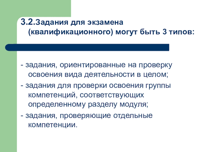 3.2.Задания для экзамена (квалификационного) могут быть 3 типов:- задания, ориентированные на проверку освоения вида деятельности в целом;-