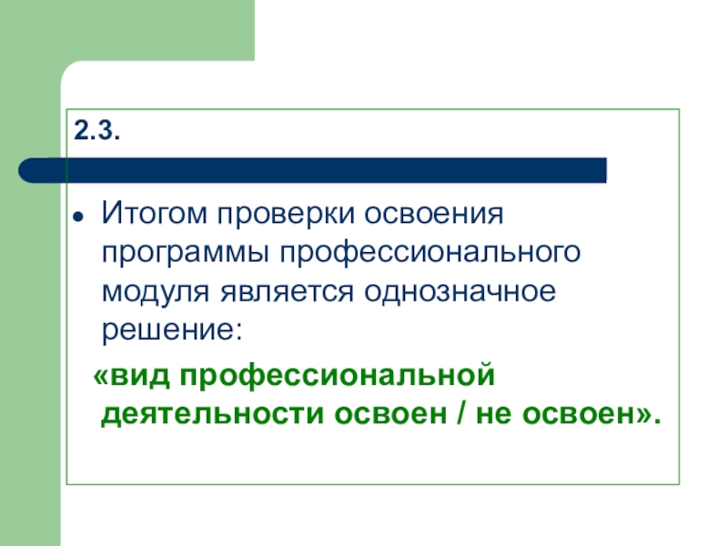 2.3.	Итогом проверки освоения программы профессионального модуля является однозначное решение:  «вид профессиональной деятельности освоен / не освоен».