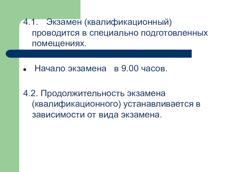 4.1.	Экзамен (квалификационный) проводится в специально подготовленных помещениях. Начало экзамена  в 9.00 часов. 4.2. Продолжительность экзамена (квалификационного)