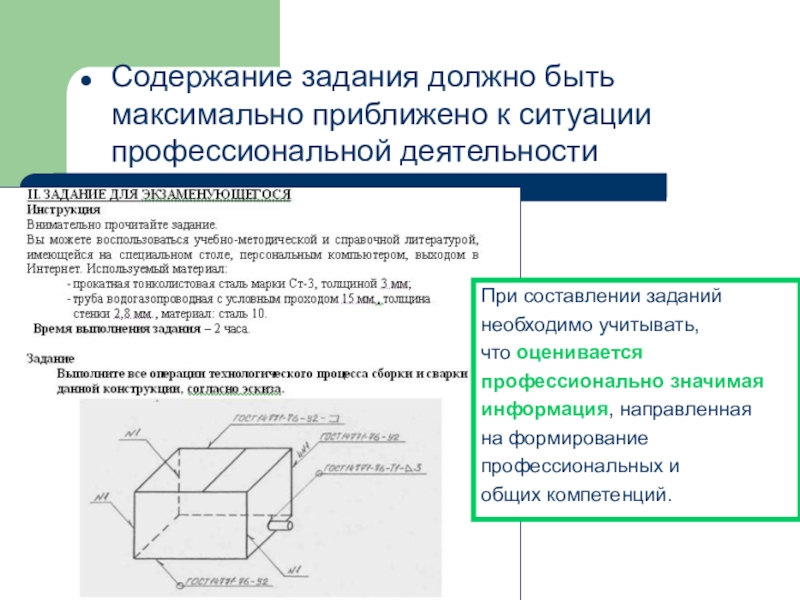 Содержание задания должно быть максимально приближено к ситуации профессиональной деятельности При составлении заданий необходимо учитывать,что оценивается профессионально