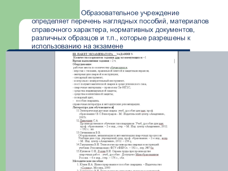 Образовательное учреждение определяет перечень наглядных пособий, материалов справочного характера, нормативных документов, различных образцов и т.п., которые разрешены к использованию на экзамене