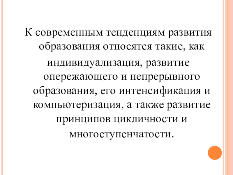 непрерывного образования, его интенсификация и компьютеризация, а также развитие принципов цикличности и многоступенчатости.