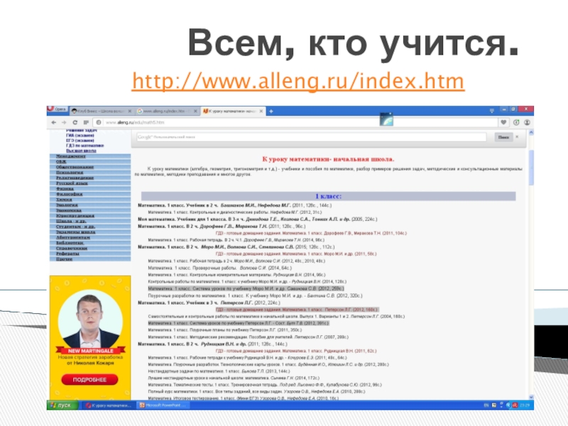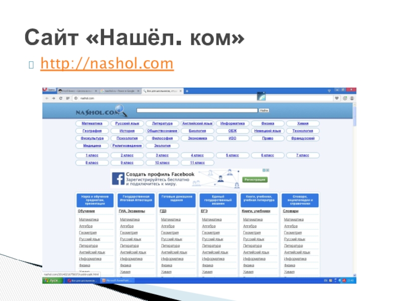 Это сайт презентаций, где можно хранить и обмениваться своими презентациями, докладами, проектами, шаблонами в формате PowerPoint с другими пользователями. Мы помогаем школьникам, студентам, учителям, преподавателям хранить и обмениваться учебными материалами.