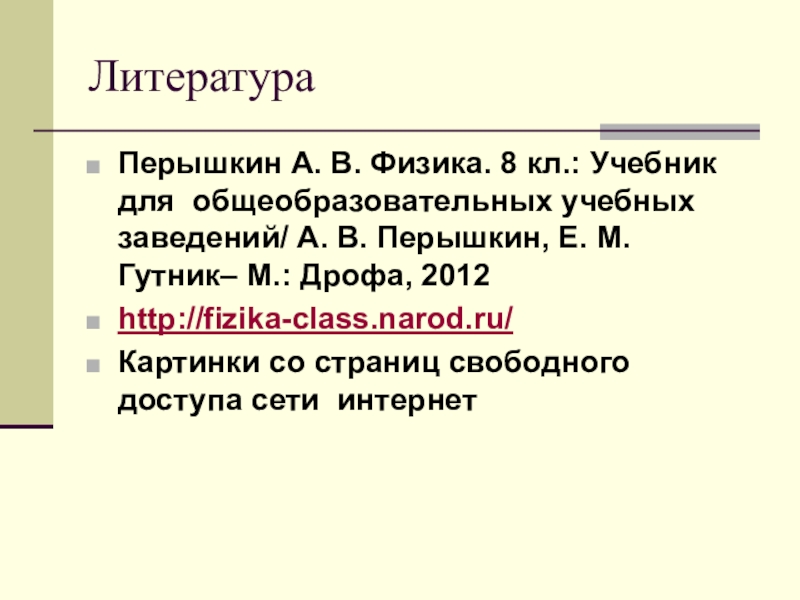 ЛитератураПерышкин А. В. Физика. 8 кл.: Учебник для общеобразовательных учебных заведений/ А. В. Перышкин, Е. М. Гутник–