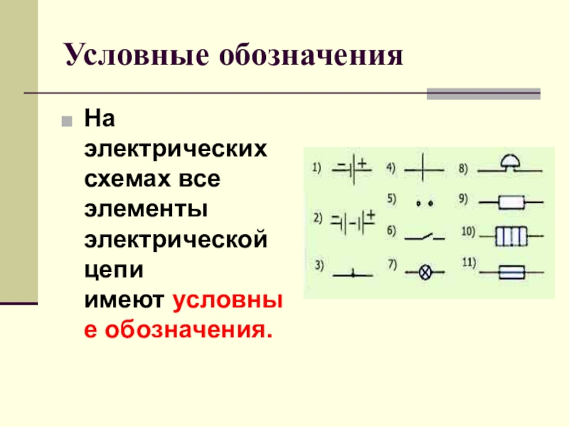 Условные обозначенияНа электрических схемах все элементы электрической цепи имеют условные обозначения.