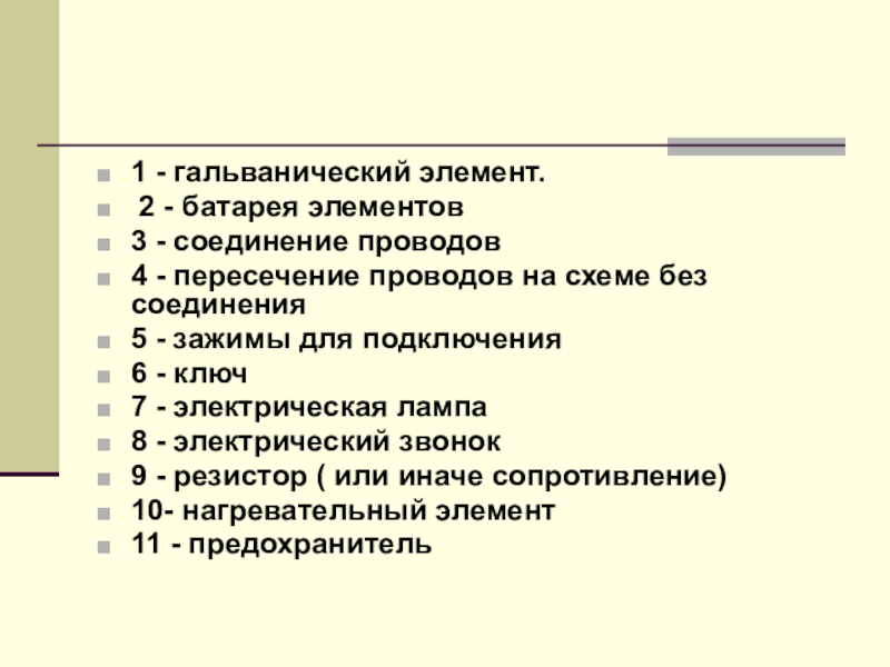1 - гальванический элемент. 2 - батарея элементов 3 - соединение проводов 4 - пересечение проводов на схеме без соединения 5