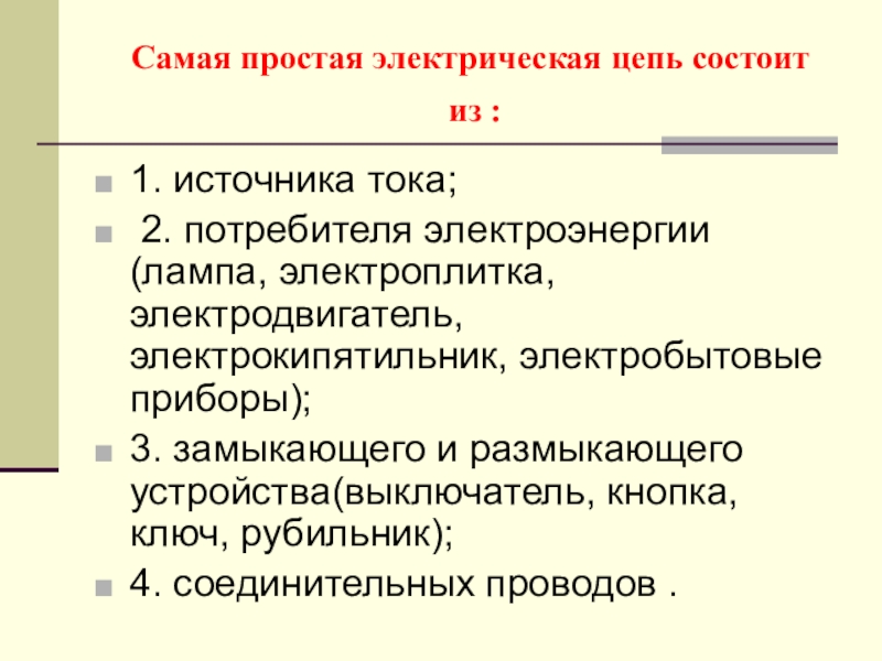 Самая простая электрическая цепь состоит  из : 1. источника тока; 2. потребителя электроэнергии (лампа, электроплитка, электродвигатель, электрокипятильник, электробытовые приборы);3.