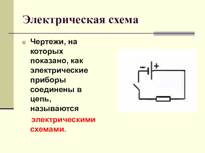 Электрическая схемаЧертежи, на которых показано, как электрические приборы соединены в цепь, называются   электрическими схемами.
