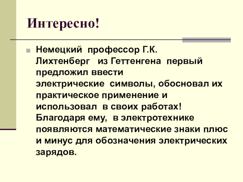 Интересно!Немецкий  профессор Г.К. Лихтенберг   из Геттенгена  первый предложил ввести электрические  символы, обосновал их практическое применение и использовал  в своих