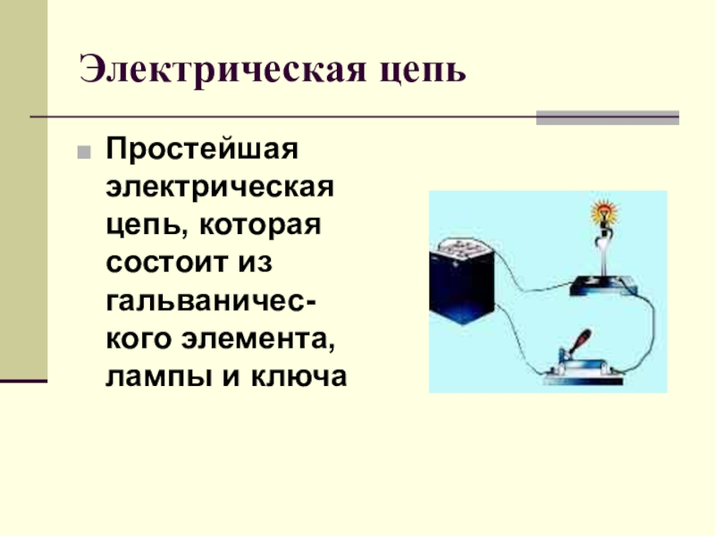 Электрическая цепьПростейшая электрическая цепь, которая состоит из гальваничес-кого элемента, лампы и ключа
