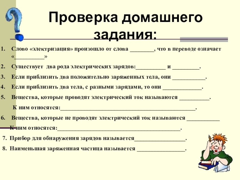 Проверка домашнего задания:Слово «электризация» произошло от слова ________, что в переводе означает «__________» Существует два рода электрических зарядов:__________ и _________.Если приблизить два положительно