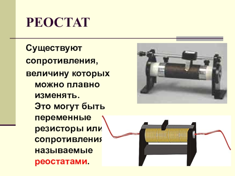 РЕОСТАТ Существуют сопротивления, величину которых можно плавно изменять. Это могут быть переменные резисторы или сопротивления, называемые реостатами.