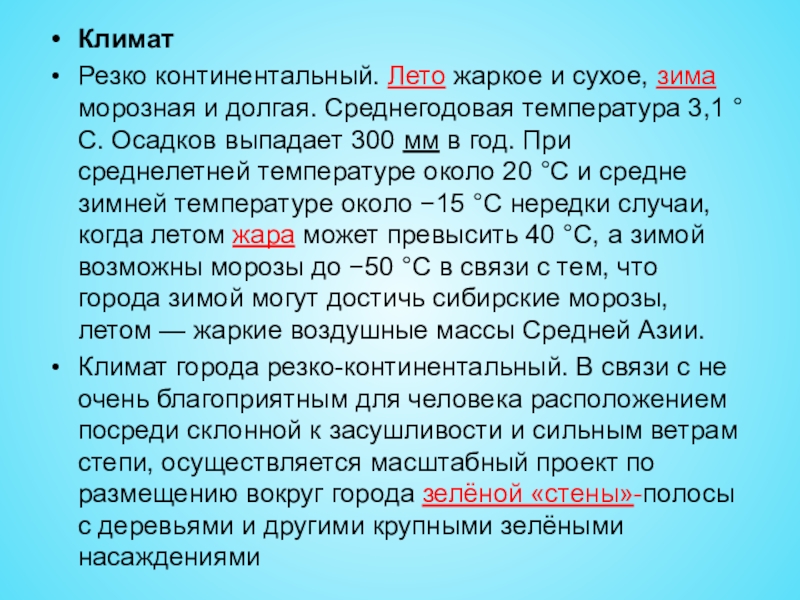 Климат города резко-континентальный. В связи с не очень благоприятным для человека расположением посреди склонной к засушливости и сильным ветрам степи, осуществляется масштабный проект по размещению вокруг города зелёной «стены»-полосы с деревьями и другими крупными зелёными насаждениями