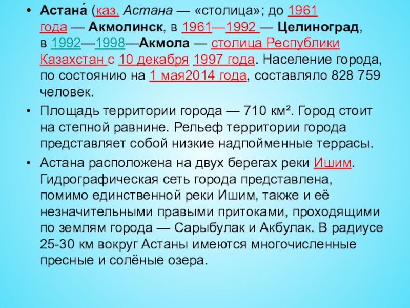 Слайд 8Астана́ (каз. Астана — «столица»; до 1961 года — Акмолинск, в 1961—1992 — Целиноград, в 1992—1998—Акмола — столица Республики Казахстан с 10 декабря 1997 года.