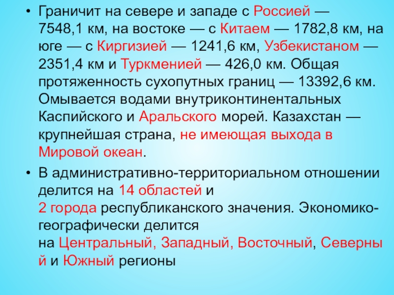на юге — с Киргизией — 1241,6 км, Узбекистаном — 2351,4 км и Туркменией — 426,0 км. Общая протяженность сухопутных границ — 13392,6 км. Омывается водами внутриконтинентальных Каспийского и Аральского морей. Казахстан — крупнейшая страна, не имеющая выхода в Мировой океан.