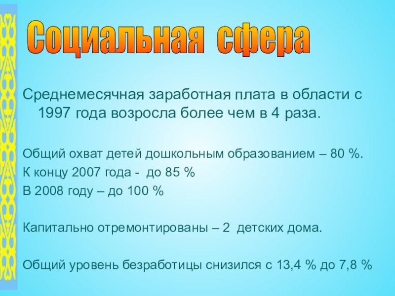 Социальная сфера Среднемесячная заработная плата в области с 1997 года возросла более чем в 4 раза.Общий охват