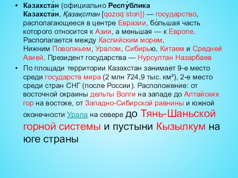 Слайд 2Казахста́н (официально Респу́блика Казахста́н, Қазақстан [qɑzɑqˈstɑn]) — государство, располагающееся в центре Евразии, бо́льшая часть которого относится к Азии, а