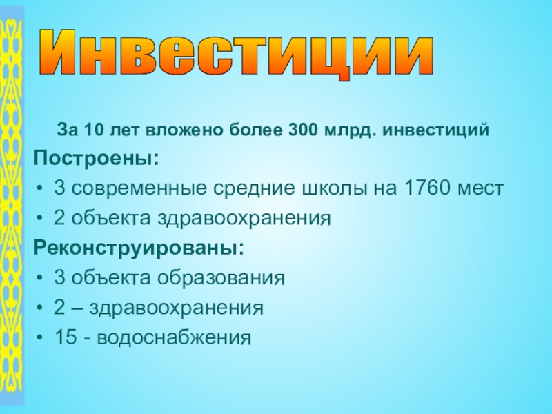 Инвестиции За 10 лет вложено более 300 млрд. инвестицийПостроены: 3 современные средние школы на 1760 мест2 объекта