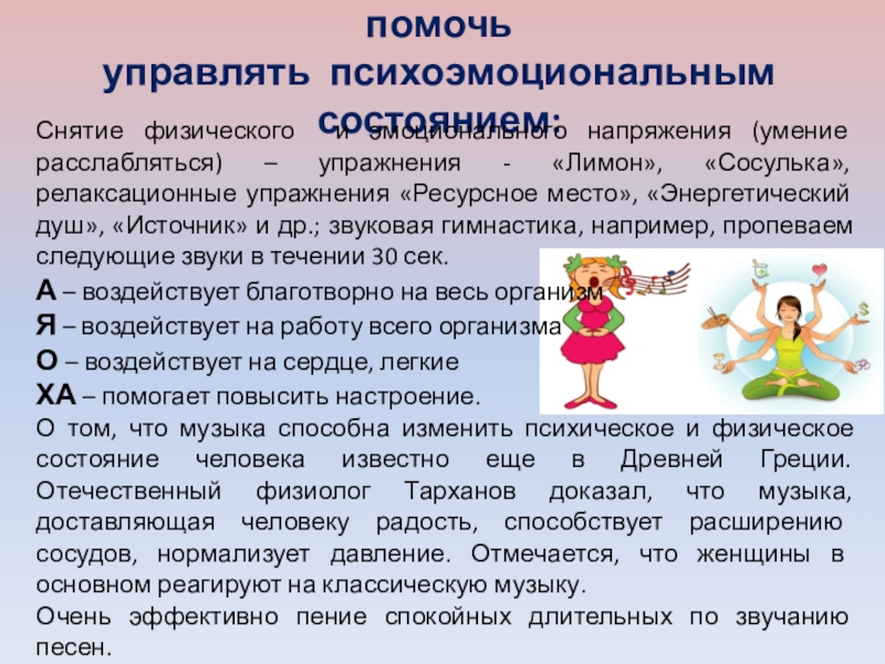 эмоционального напряжения (умение расслабляться) – упражнения - «Лимон», «Сосулька», релаксационные упражнения «Ресурсное место», «Энергетический душ», «Источник» и др.; звуковая гимнастика, например, пропеваем следующие звуки в течении 30 сек.