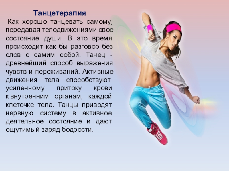 это время происходит как бы разговор без слов с самим собой. Танец - древнейший способ выражения чувств и переживаний. Активные движения тела способствуют усиленному притоку крови к внутренним органам, каждой клеточке тела. Танцы приводят нервную систему в активное деятельное состояние и дают ощутимый заряд бодрости.