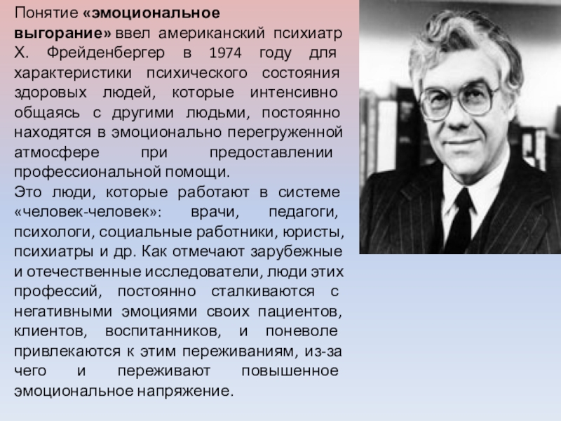 Слайд 3Понятие «эмоциональное выгорание» ввел американский психиатр Х. Фрейденбергер в 1974 году для характеристики