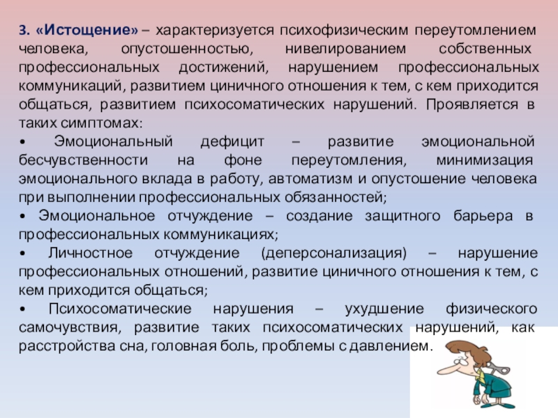 Слайд 63. «Истощение» – характеризуется психофизическим переутомлением человека, опустошенностью, нивелированием собственных профессиональных достижений,
