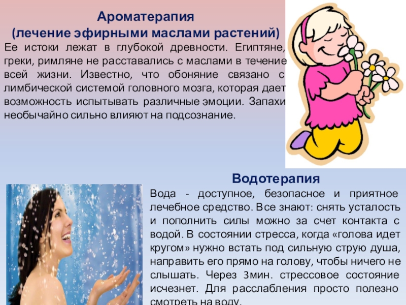 Вода - доступное, безопасное и приятное лечебное средство. Все знают: снять усталость и пополнить силы можно за счет контакта с водой. В состоянии стресса, когда «голова идет кругом» нужно встать под сильную струю душа, направить его прямо на голову, чтобы ничего не слышать. Через 3мин. стрессовое состояние исчезнет. Для расслабления просто полезно смотреть на воду.