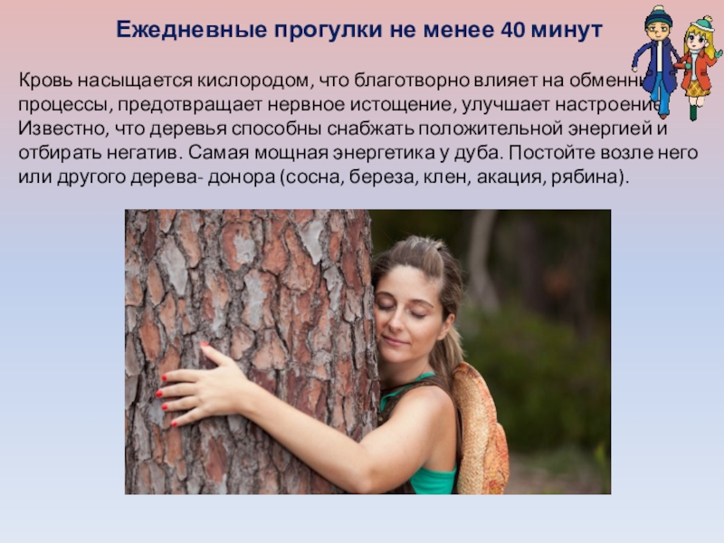на обменные процессы, предотвращает нервное истощение, улучшает настроение. Известно, что деревья способны снабжать положительной энергией и отбирать негатив. Самая мощная энергетика у дуба. Постойте возле него или другого дерева- донора (сосна, береза, клен, акация, рябина).
