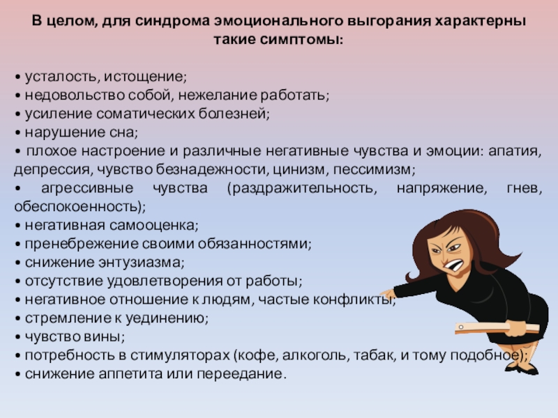 Слайд 7В целом, для синдрома эмоционального выгорания характерны такие симптомы: