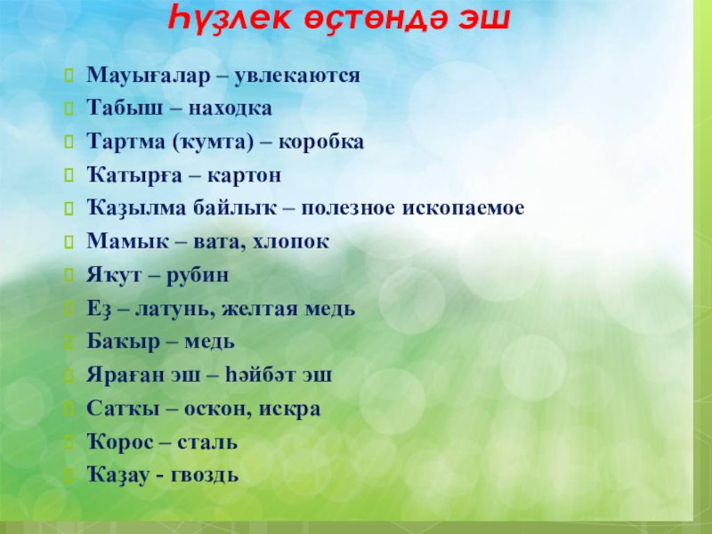 Һүҙлек өҫтөндә эшМауығалар – увлекаютсяТабыш – находкаТартма (ҡумта) – коробкаҠатырға – картонҠаҙылма байлыҡ – полезное ископаемоеМамык –