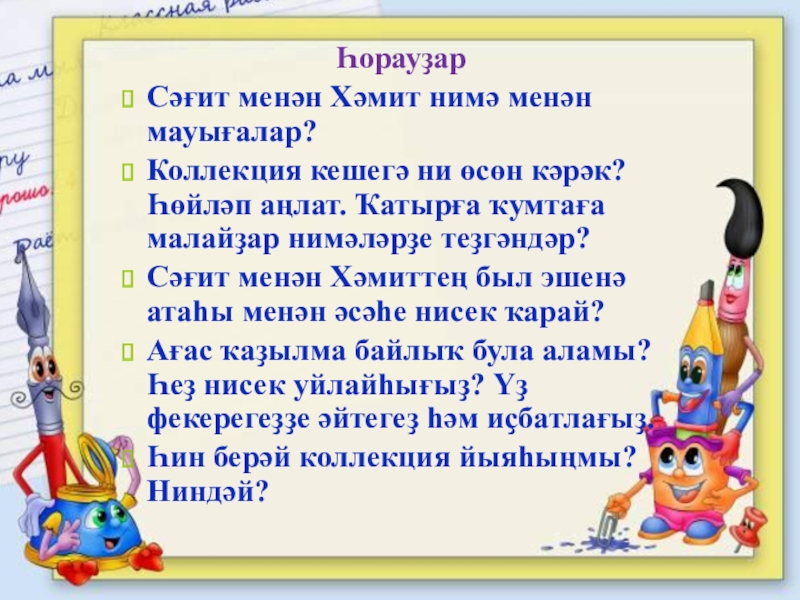 ҺорауҙарСәғит менән Хәмит нимә менән мауығалар?Коллекция кешегә ни өсөн кәрәк? Һөйләп аңлат. Ҡатырға ҡумтаға малайҙар нимәләрҙе теҙгәндәр?Сәғит