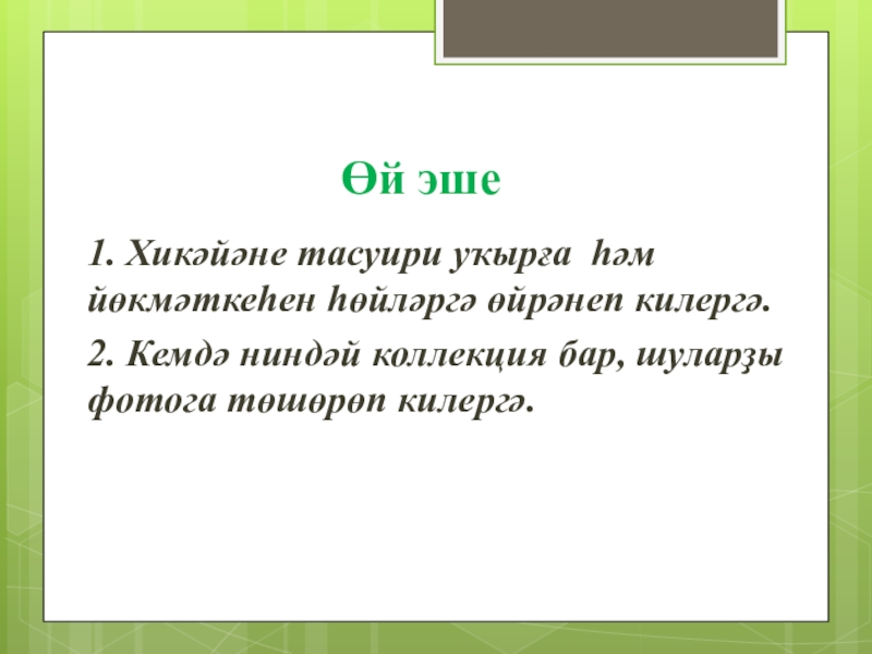 Өй эше1. Хикәйәне тасуири уҡырға һәм йөкмәткеһен һөйләргә өйрәнеп килергә. 2. Кемдә ниндәй коллекция бар, шуларҙы фотога