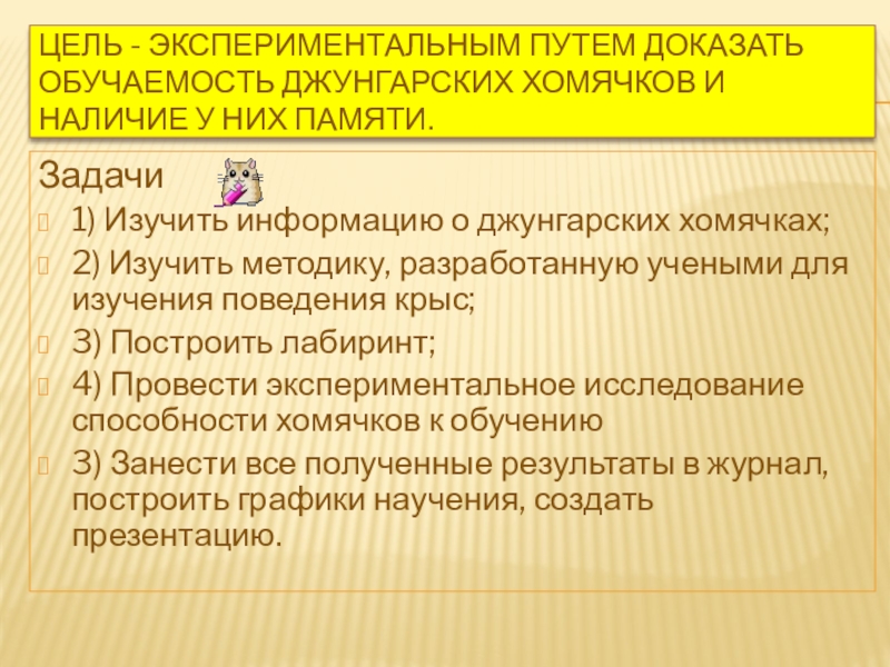 4) Провести экспериментальное исследование способности хомячков к обучению