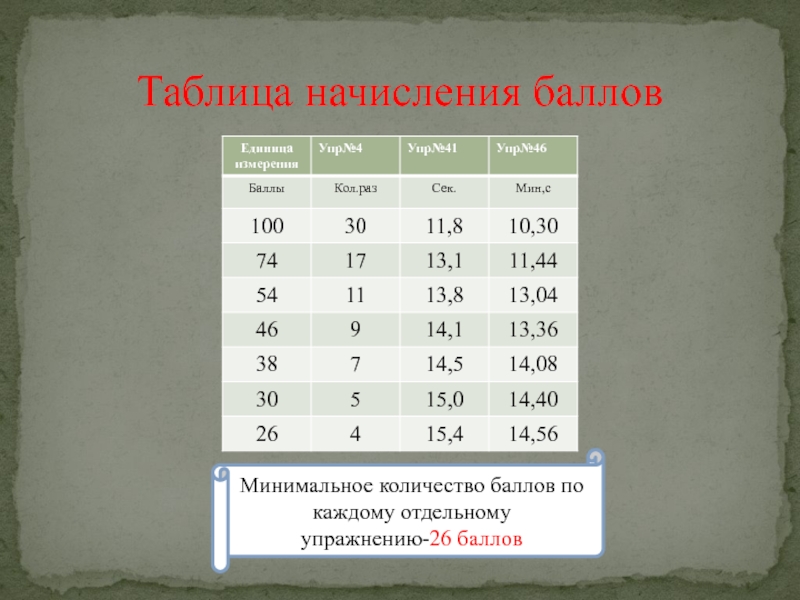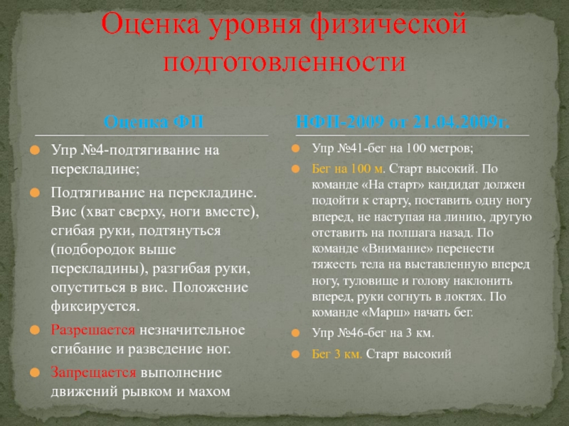 Бег на 100 м. Старт высокий. По команде «На старт» кандидат должен подойти к старту, поставить одну ногу вперед, не наступая на линию, другую отставить на полшага назад. По команде «Внимание» перенести тяжесть тела на выставленную вперед ногу, туловище и голову наклонить вперед, руки согнуть в локтях. По команде «Марш» начать бег.