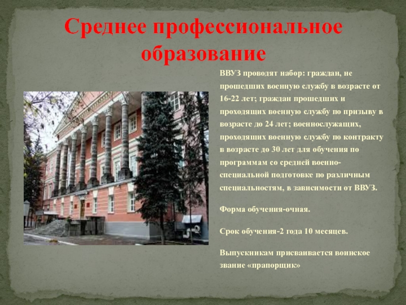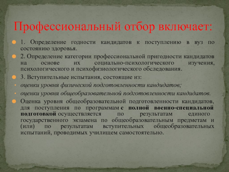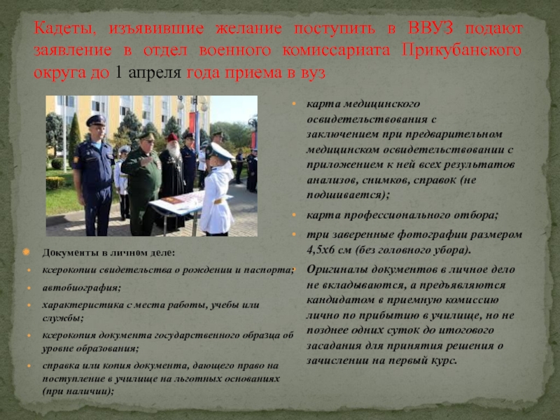 Оригиналы документов в личное дело не вкладываются, а предъявляются кандидатом в приемную комиссию лично по прибытию в училище, но не позднее одних суток до итогового засадания для принятия решения о зачислении на первый курс.