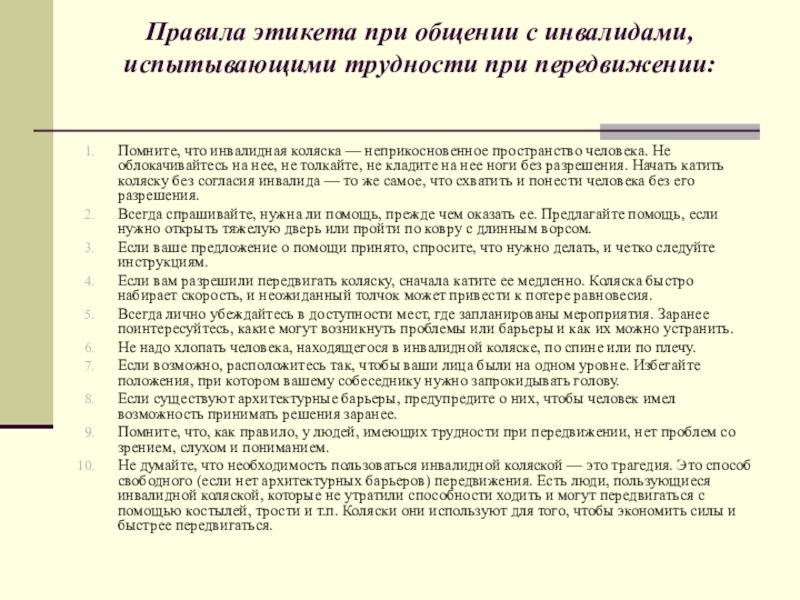 Слайд 11Правила этикета при общении с инвалидами, испытывающими трудности при передвижении: