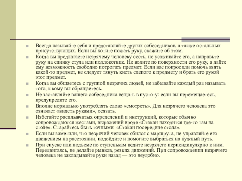 Когда вы общаетесь с группой незрячих людей, не забывайте каждый раз называть того, к кому вы обращаетесь.