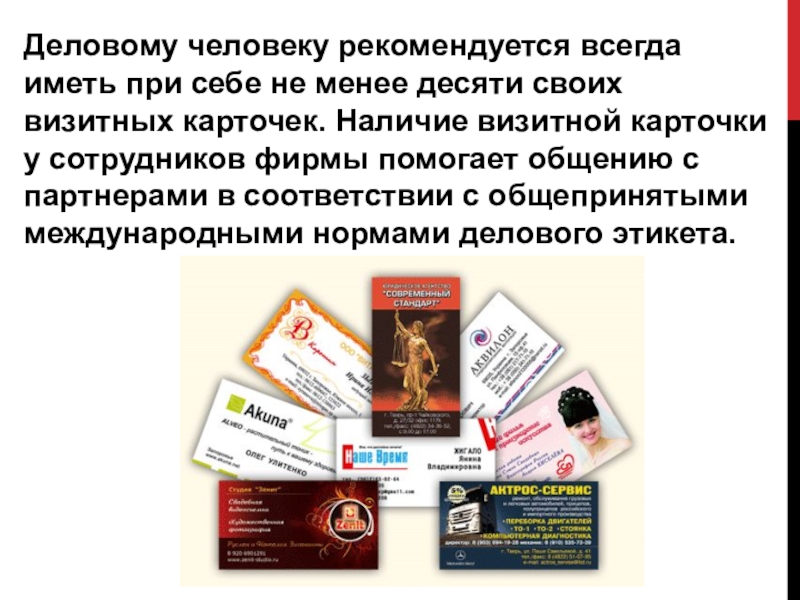 Слайд 12Деловому человеку рекомендуется всегда иметь при себе не менее десяти своих