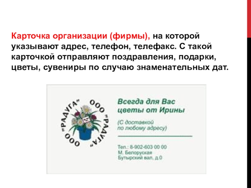 Слайд 7Карточка организации (фирмы), на которой указывают адрес, телефон, телефакс. С такой