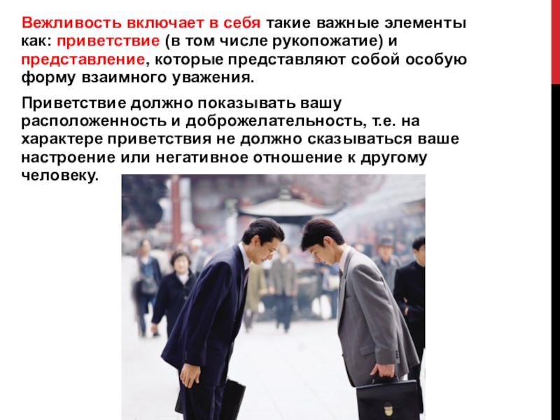 Слайд 14Вежливость включает в себя такие важные элементы как: приветствие (в том