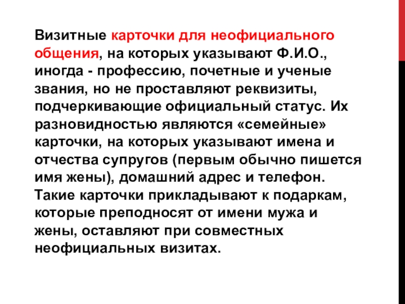 профессию, почетные и ученые звания, но не проставляют реквизиты, подчеркивающие официальный статус. Их разновидностью являются «семейные» карточки, на которых указывают имена и отчества супругов (первым обычно пишется имя жены), домашний адрес и телефон. Такие карточки прикладывают к подаркам, которые преподносят от имени мужа и жены, оставляют при совместных неофициальных визитах.