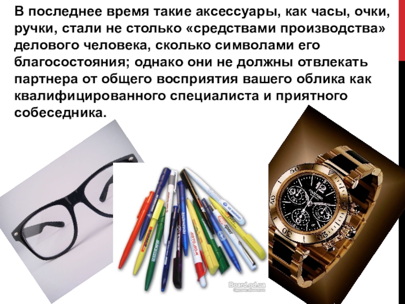 Слайд 19В последнее время такие аксессуары, как часы, очки, ручки, стали не