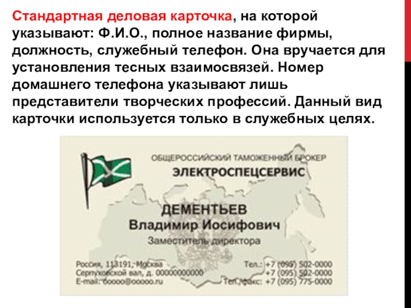 Слайд 6Стандартная деловая карточка, на которой указывают: Ф.И.О., полное название фирмы, должность,